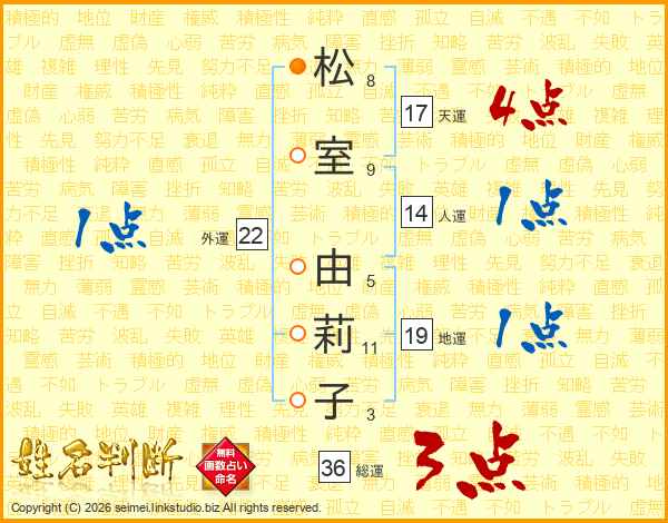松(8画)室(9画) 由(5画)莉(11画)子(3画)