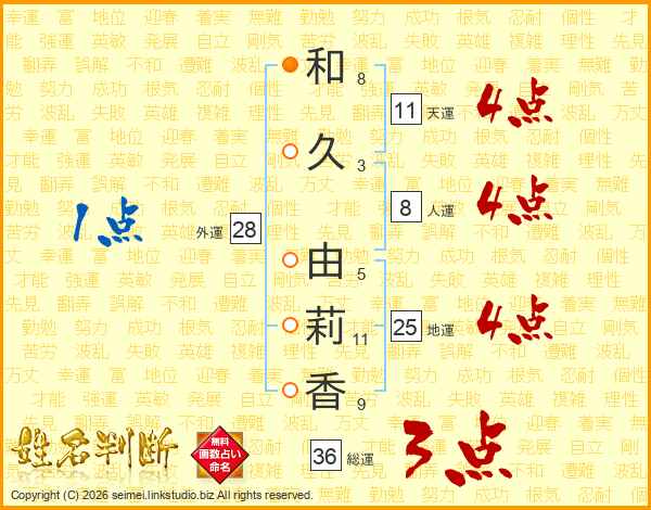 和(8画)久(3画) 由(5画)莉(11画)香(9画)