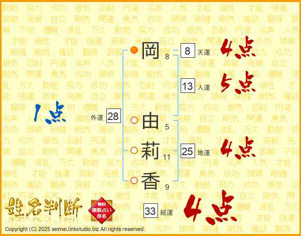 生活面を象徴する運勢です。外部から受ける影響力を表し、結婚運、家庭運や職場、環境への順応性を表します。総運から人運を引いた画数。姓や名が1文字の場合を除く。
