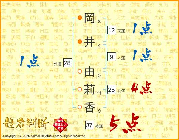 岡(8画)井(4画) 由(5画)莉(11画)香(9画)
