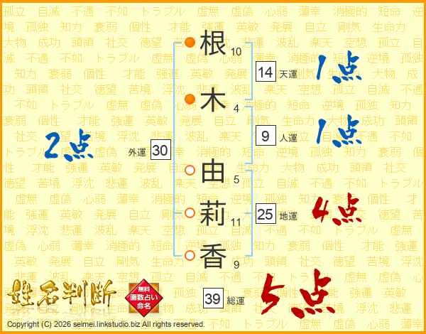根(10画)木(4画) 由(5画)莉(11画)香(9画)