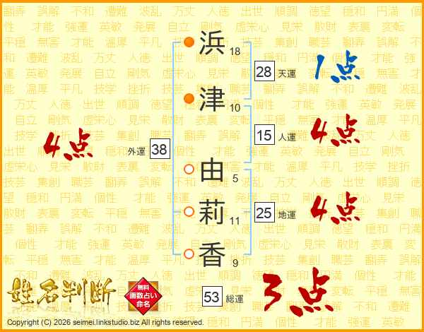 浜(18画)津(10画) 由(5画)莉(11画)香(9画)