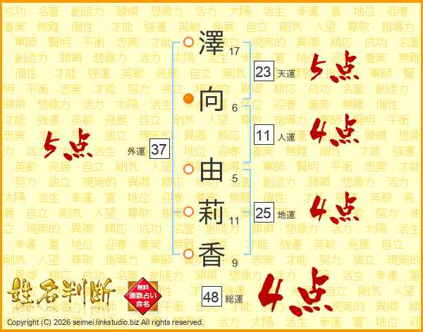 澤(17画)向(6画) 由(5画)莉(11画)香(9画)