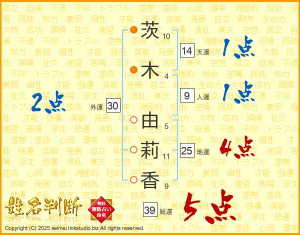 茨(10画)木(4画) 由(5画)莉(11画)香(9画)