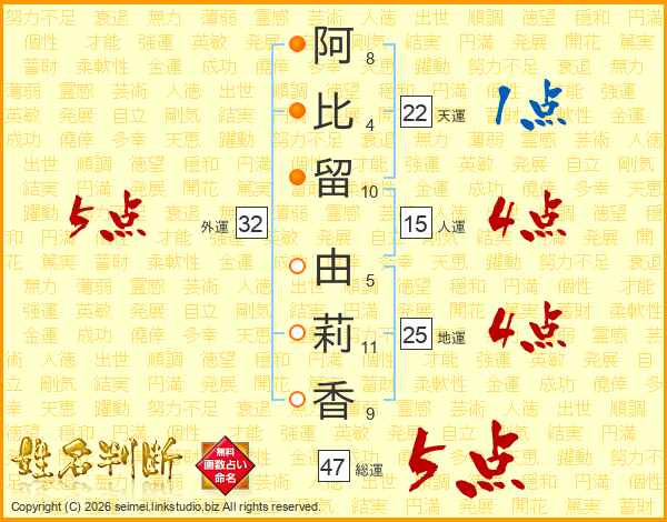 阿(8画)比(4画)留(10画) 由(5画)莉(11画)香(9画)