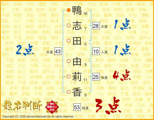 鴨(16画)志(7画)田(5画) 由(5画)莉(11画)香(9画)