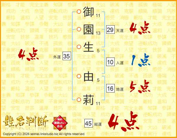 御(11画)園(13画)生(5画) 由(5画)莉(11画)