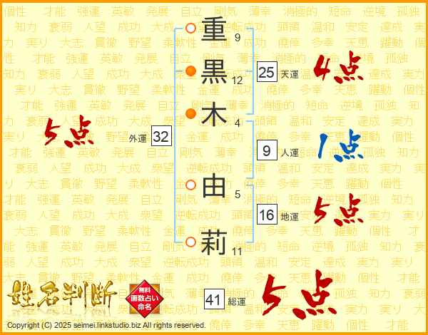 重(9画)黒(12画)木(4画) 由(5画)莉(11画)
