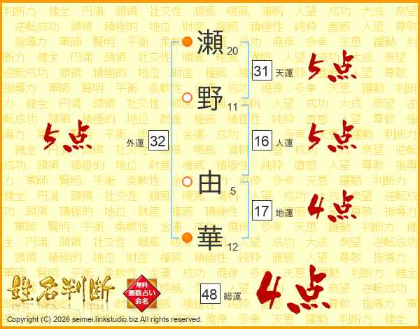 瀬野由華さんの外運は32画の5点!