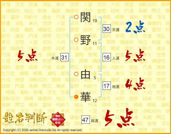 関(19画)野(11画) 由(5画)華(12画)