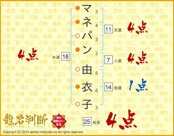 マ(2画)ネ(4画)パ(3画)ン(2画) 由(5画)衣(6画)子(3画)