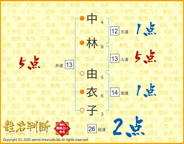 中(4画)林(8画) 由(5画)衣(6画)子(3画)