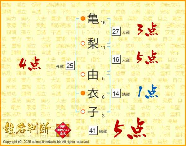 亀(16画)梨(11画) 由(5画)衣(6画)子(3画)