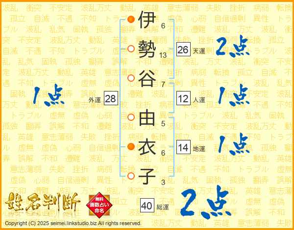 伊(6画)勢(13画)谷(7画) 由(5画)衣(6画)子(3画)
