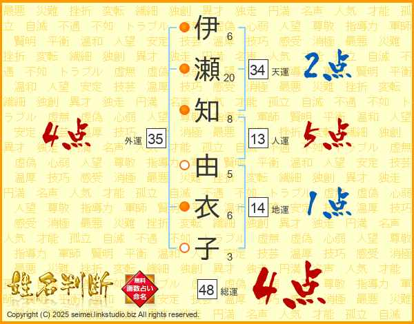 伊(6画)瀬(20画)知(8画) 由(5画)衣(6画)子(3画)