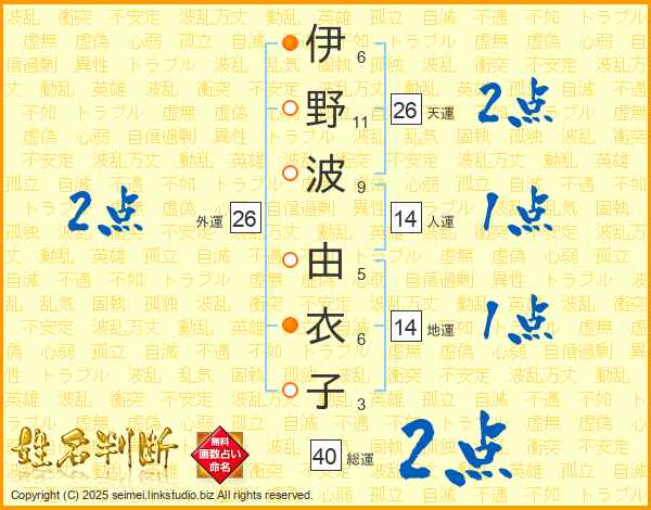 伊(6画)野(11画)波(9画) 由(5画)衣(6画)子(3画)
