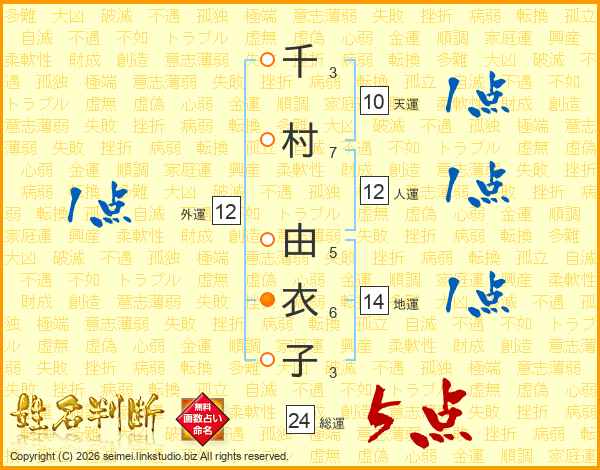 千(3画)村(7画) 由(5画)衣(6画)子(3画)