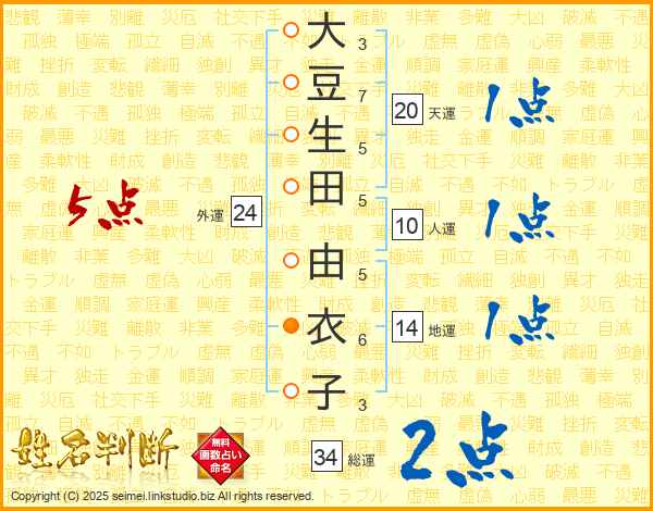 生活面を象徴する運勢です。外部から受ける影響力を表し、結婚運、家庭運や職場、環境への順応性を表します。総運から人運を引いた画数。姓や名が1文字の場合を除く。