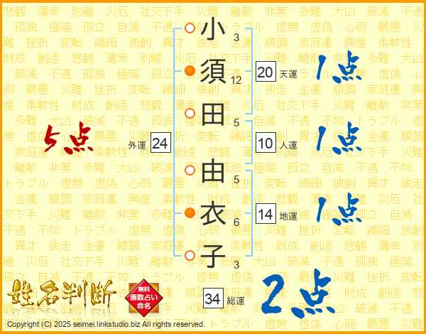 小(3画)須(12画)田(5画) 由(5画)衣(6画)子(3画)