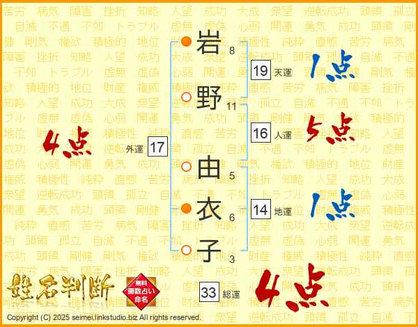 岩野由衣子さんの総運は33画の4点!