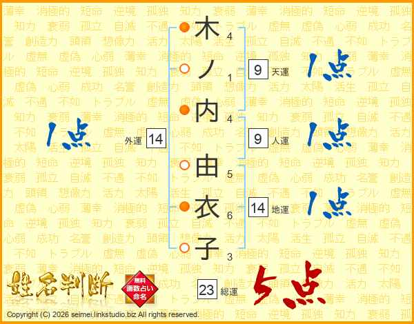 木(4画)ノ(1画)内(4画) 由(5画)衣(6画)子(3画)