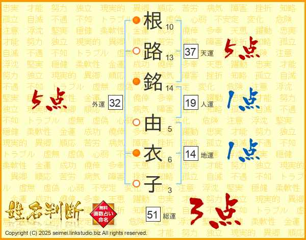 根(10画)路(13画)銘(14画) 由(5画)衣(6画)子(3画)