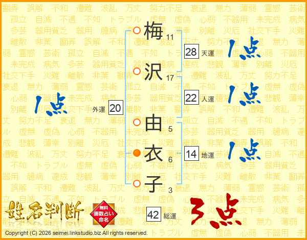 梅(11画)沢(17画) 由(5画)衣(6画)子(3画)
