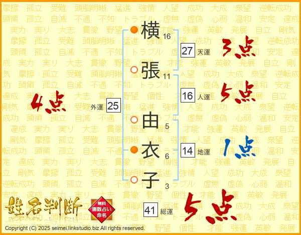 横(16画)張(11画) 由(5画)衣(6画)子(3画)