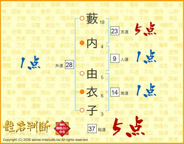 藪(19画)内(4画) 由(5画)衣(6画)子(3画)