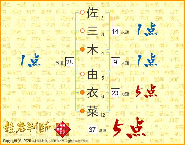 佐(7画)三(3画)木(4画) 由(5画)衣(6画)菜(12画)