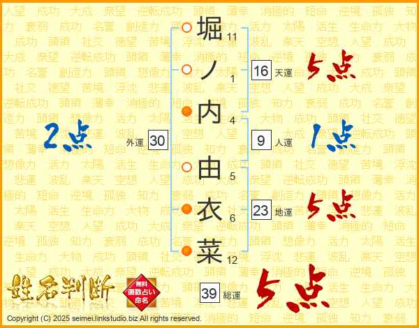 堀(11画)ノ(1画)内(4画) 由(5画)衣(6画)菜(12画)