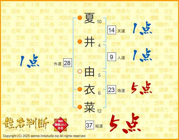 夏(10画)井(4画) 由(5画)衣(6画)菜(12画)