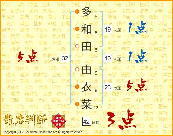多(6画)和(8画)田(5画) 由(5画)衣(6画)菜(12画)