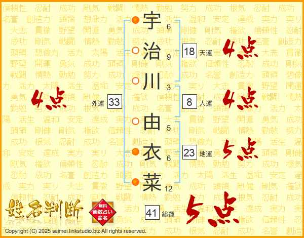 宇(6画)治(9画)川(3画) 由(5画)衣(6画)菜(12画)