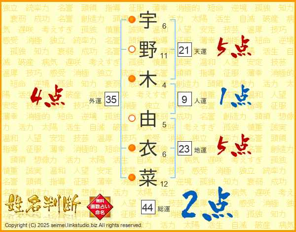 宇(6画)野(11画)木(4画) 由(5画)衣(6画)菜(12画)
