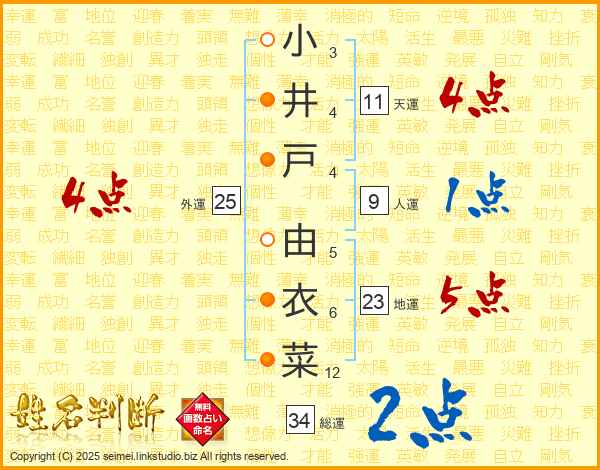 小(3画)井(4画)戸(4画) 由(5画)衣(6画)菜(12画)