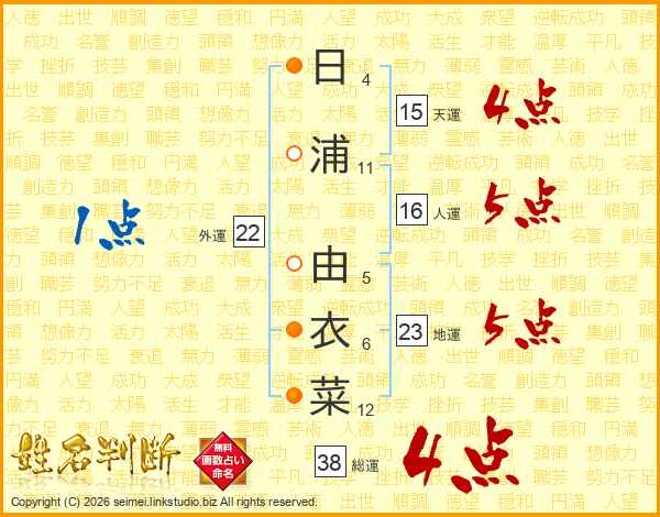 日(4画)浦(11画) 由(5画)衣(6画)菜(12画)