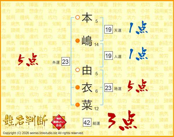 本(5画)嶋(14画) 由(5画)衣(6画)菜(12画)