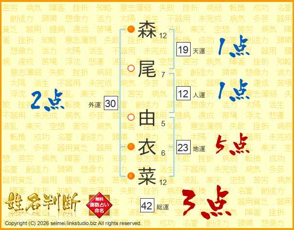 森(12画)尾(7画) 由(5画)衣(6画)菜(12画)