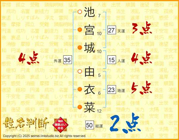 生活面を象徴する運勢です。外部から受ける影響力を表し、結婚運、家庭運や職場、環境への順応性を表します。総運から人運を引いた画数。姓や名が1文字の場合を除く。