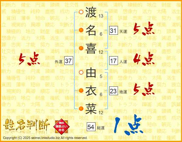 渡(13画)名(6画)喜(12画) 由(5画)衣(6画)菜(12画)