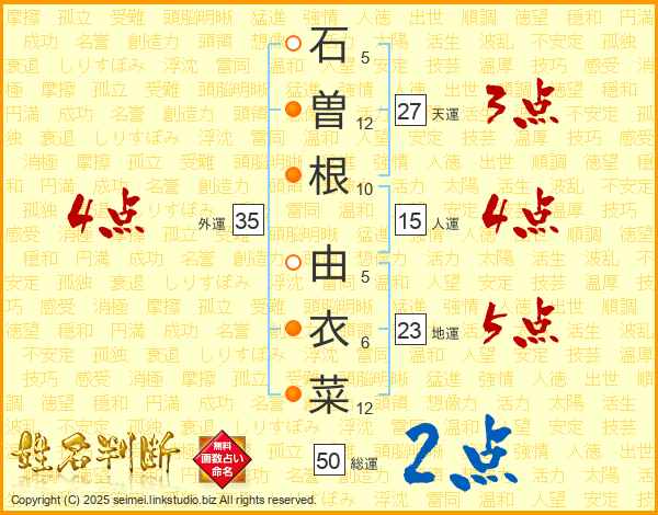 石(5画)曽(12画)根(10画) 由(5画)衣(6画)菜(12画)