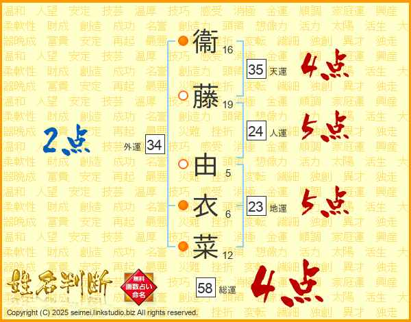 衞(16画)藤(19画) 由(5画)衣(6画)菜(12画)