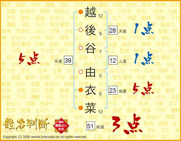 越後谷由衣菜さんの総運は51画の3点!