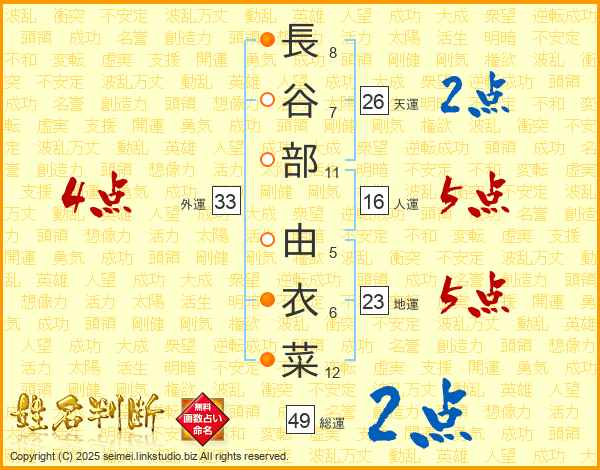 長(8画)谷(7画)部(11画) 由(5画)衣(6画)菜(12画)