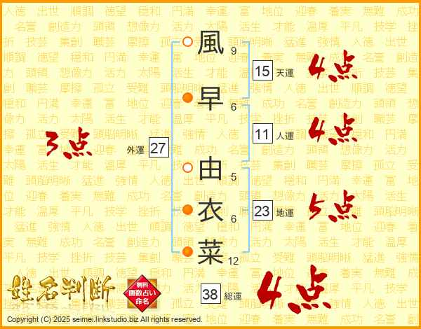 風(9画)早(6画) 由(5画)衣(6画)菜(12画)
