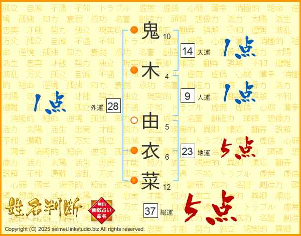 鬼木由衣菜さんの総運は37画の5点!