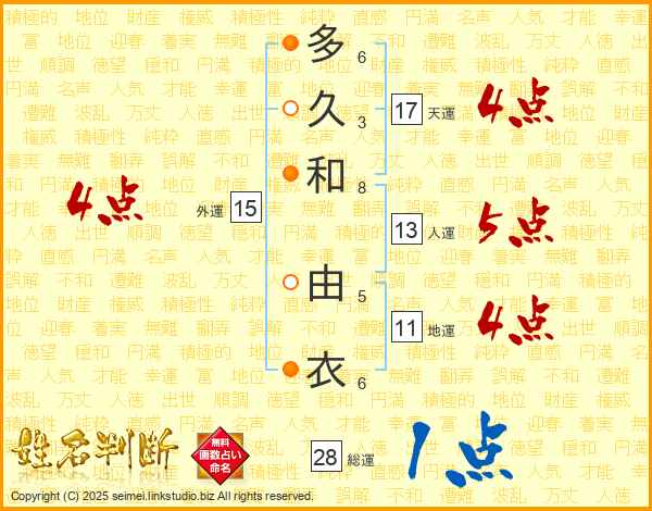 生活面を象徴する運勢です。外部から受ける影響力を表し、結婚運、家庭運や職場、環境への順応性を表します。総運から人運を引いた画数。姓や名が1文字の場合を除く。