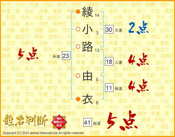 綾(14画)小(3画)路(13画) 由(5画)衣(6画)