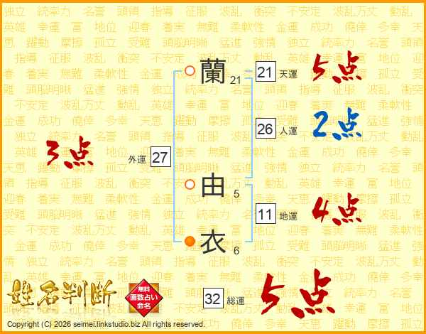 生活面を象徴する運勢です。外部から受ける影響力を表し、結婚運、家庭運や職場、環境への順応性を表します。総運から人運を引いた画数。姓や名が1文字の場合を除く。